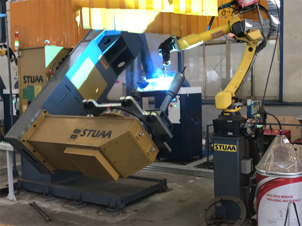 一套完整的弧焊机器人系统,应包括机器人机械手、控制系统、嘿嘿连载APP黄版下载装置、焊件夹持装置。夹持装置上有二组可以轮番进入机器人工作范围的旋转工作台。